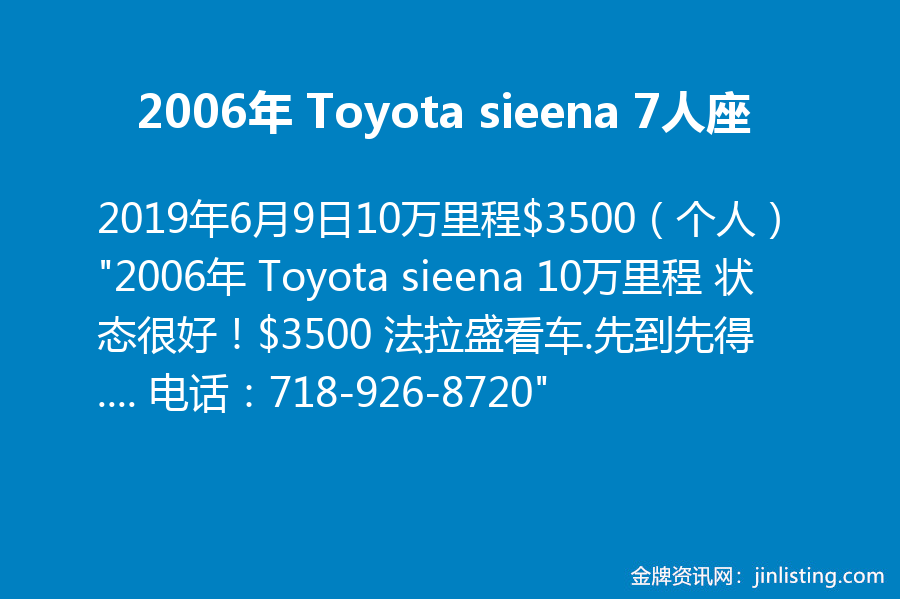 2006年 Toyota sieena 7人座 10万里程$3500(个人) “2006年 Toyota sieena 10万里程 状态很好!$3500 法拉盛看车.先到先得…. 电话:718-926-8720”
