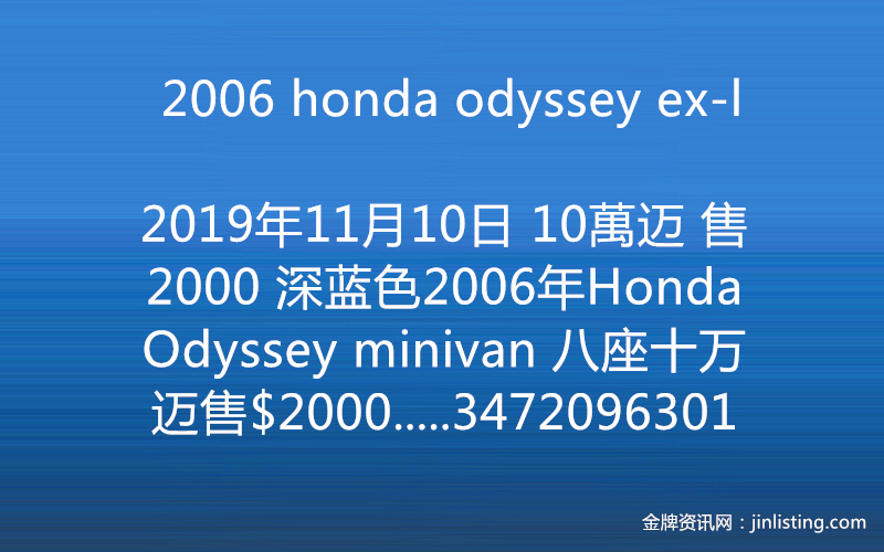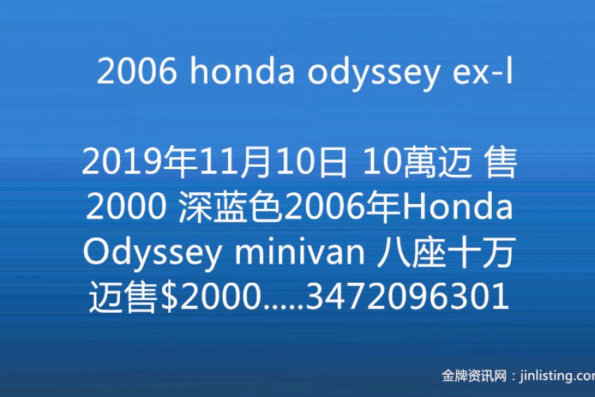 2006 honda odyssey ex-l 10萬迈 售2000 深蓝色2006年Honda Odyssey minivan 八座十万迈售$2000. 可以议价。车身有碰撞。挡风玻璃有裂痕。波箱引擎运行良好。适合送货或装修用车。地点紐約市Brooklyn Bensonhurst.有兴趣者,请短信或电3472096301