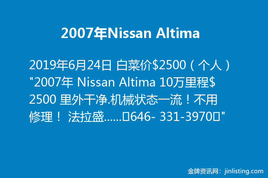 2007年Nissan Altima 白菜价$2500(个人) “2007年 Nissan Altima 10万里程$2500 里外干净.机械状态一流!不用修理! 法拉盛147st北方大道看车 电话:646- 331-3970”