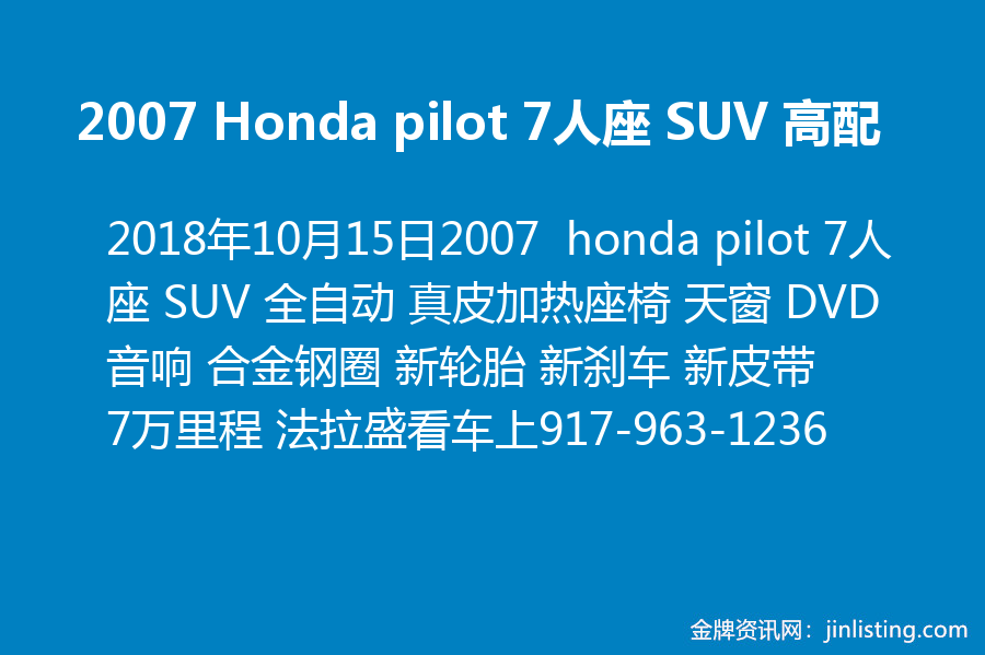 2007 honda pilot 7人座 SUV 全自动 真皮加热座椅 天窗 DVD音响 合金钢圈 新轮胎 新刹车 新皮带 7万里程 法拉盛看车上917-963-1236