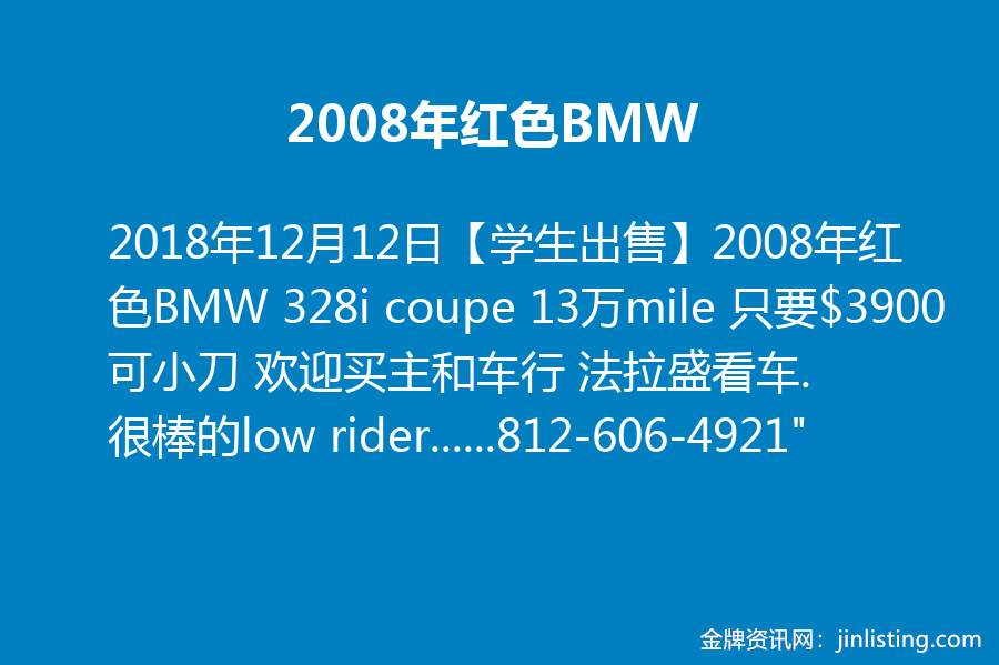 “【学生出售】2008年红色BMW 328i coupe 13万mile 只要$3900 可小刀 欢迎买主和车行 法拉盛看车. 很棒的low rider美国人大爱这个双门款式的328 寻个有缘车主收走。短信:812-606-4921”