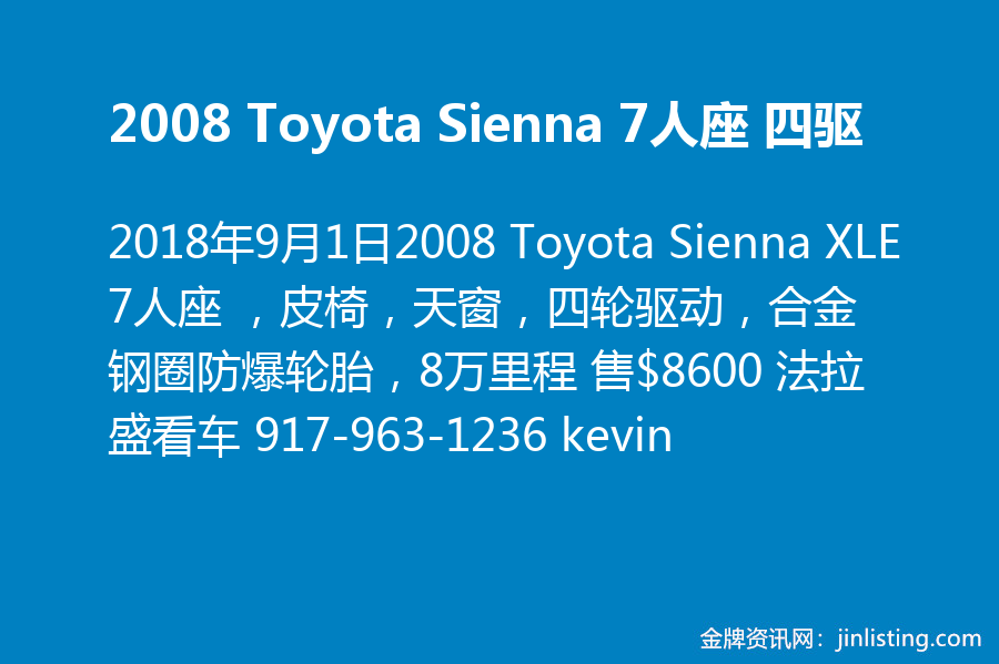 2008 Toyota Sienna XLE 7人座 ,皮椅,天窗,四轮驱动,合金钢圈防爆轮胎,8万里程 售$8600 法拉盛看车 917-963-1236 kevin