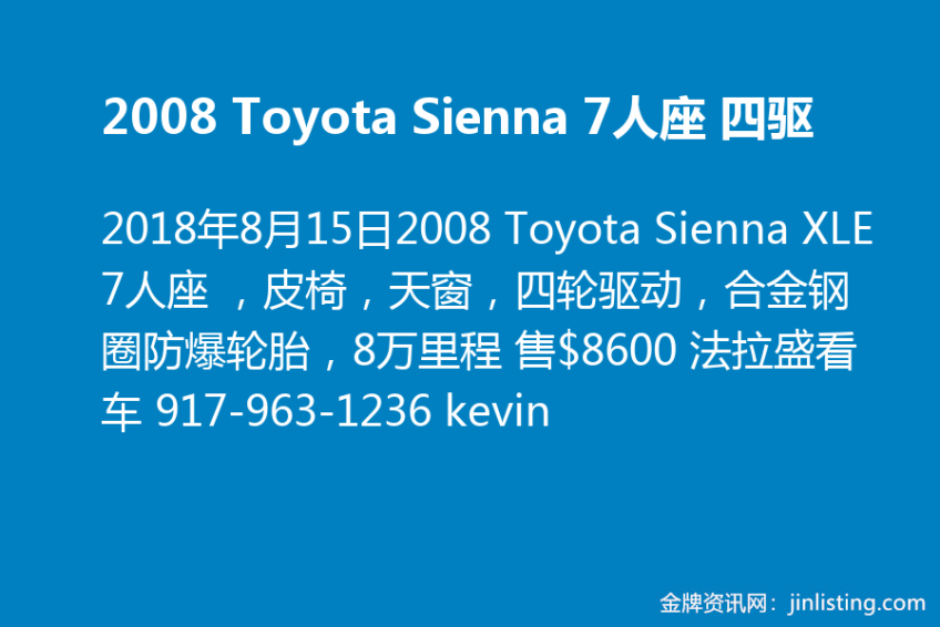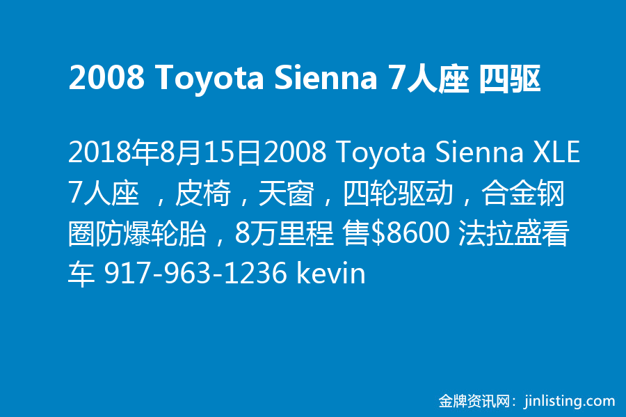 2008 Toyota Sienna 7人座 四驱 顶级配置 低里程 ,皮椅,天窗,四轮驱动,合金钢圈防爆轮胎,8万里程 售$8600 法拉盛看车 917-963-1236 kevin