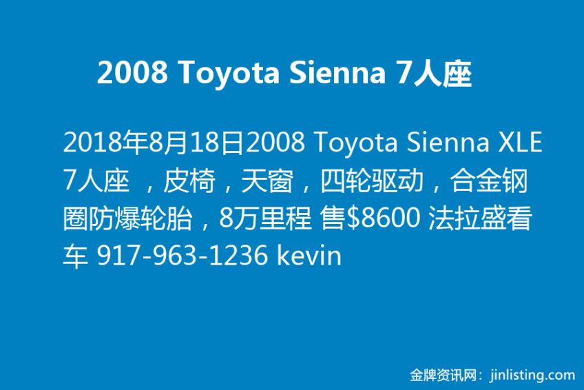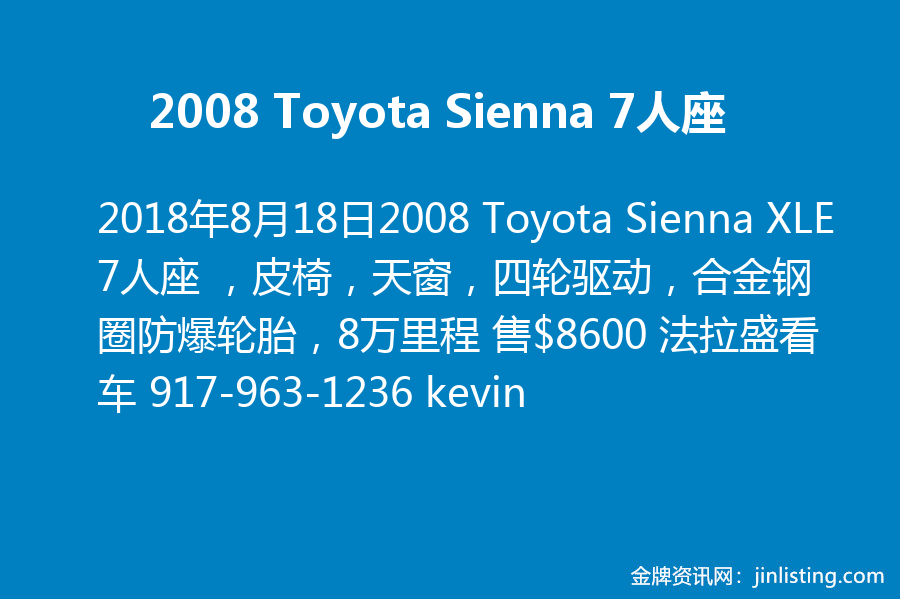2008 Toyota Sienna XLE 7人座 ,皮椅,天窗,四轮驱动,合金钢圈防爆轮胎,8万里程 售$8600 法拉盛看车 917-963-1236 kevin