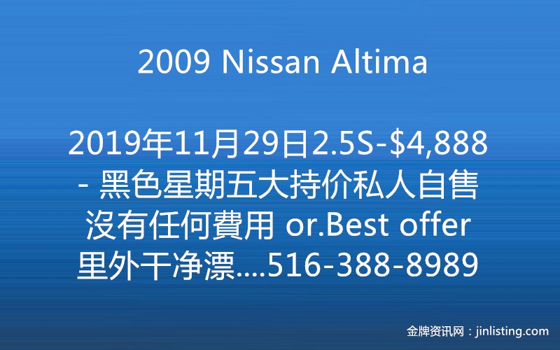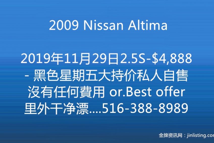 2009 Nissan Altima 2.5S – $ 4,888 – 黑色星期五大持价 私人自售 – 沒有任何費用 or. Best offer !!!!!!!! 2009 尼桑 Nissan Altima 2.5S -白色四门 $ 4,888 Or. Best Offer 里外干净漂亮、车况好, 保養好 5 passenger- 車大 A/C- 夏天 Very Cool Heater- 冬天 Very Warm 23/31 mpg. 省油 2.5L 4-Cyl CVT Automatic Transmission Push Start – Keyless Winds Block on 4 Windows 电话:516-388-8989 没接电话☎️,請发短信发- 會快速回复 @@@@。 車也可以在Flushing看 37-01 138 Street, Flushing NY