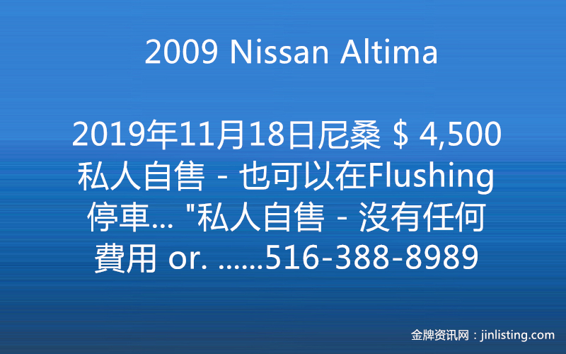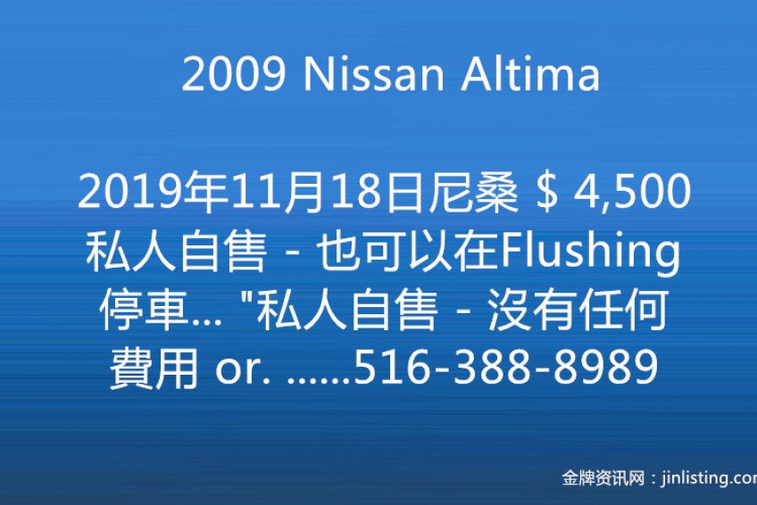 2009 Nissan Altima ( 尼桑 )- $ 4,500 私人自售 – 也可以在Flushing 停車… “私人自售 – 沒有任何費用 or. Best offer !!!!!!!! 2009 尼桑 2.5S – 四门 $ 4,500. Or. Best Offer 里外干净漂亮、车况好, 保養好 5 passenger- 車大 A/C- 夏天 Very Cool Heater- 冬天 Very Warm 23/31 mpg. 省油 2.5L 4-Cyl CVT Automatic Transmission Push Start – Keyless Winds Block on 4 Windows 电话:516-388-8989 没接电话☎️,請发短信发- 會快速回复 @@@@。 車也可以在Flushing看 37-01 138 Street, Flushing NY”