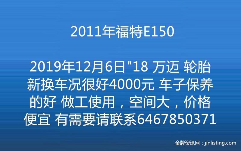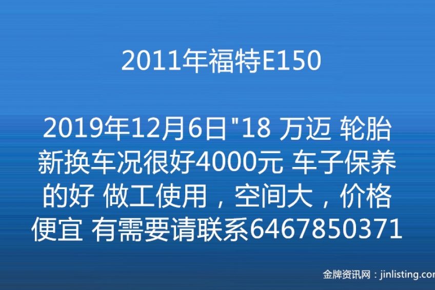 “2011年福特E150 18 万迈 轮胎新换车况很好4000元 车子保养的好 做工使用,空间大,价格便宜 有需要请联系6467850371 车子在新鲜草原,随时方便看车 实物图拍摄”