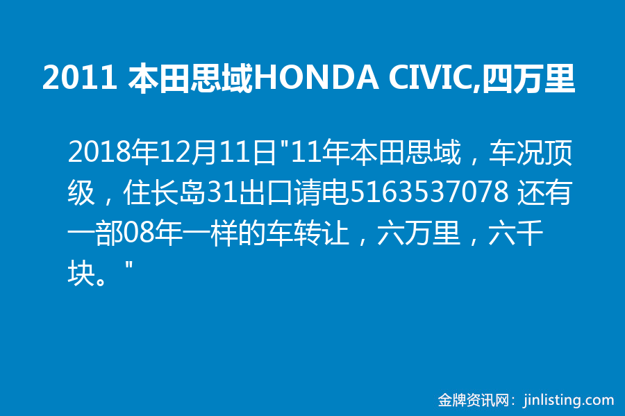 “11年本田思域,车况顶级,住长岛31出口请电5163537078