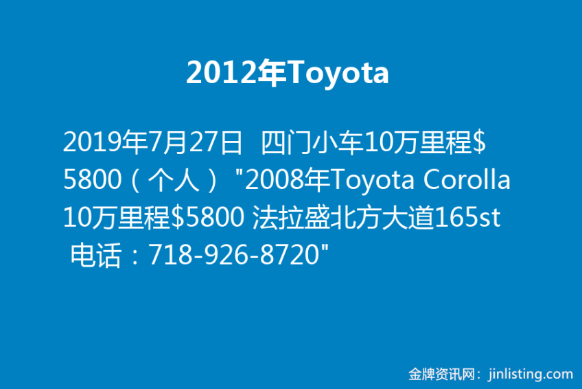 2012年Toyota 四门小车10万里程$5800(个人) “2008年Toyota Corolla 10万里程$5800 法拉盛北方大道165st 电话:718-926-8720”