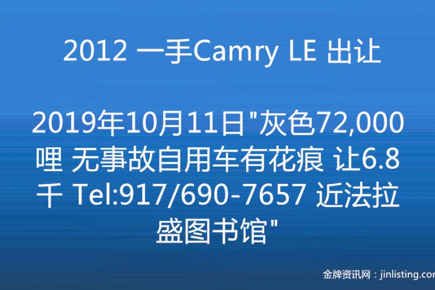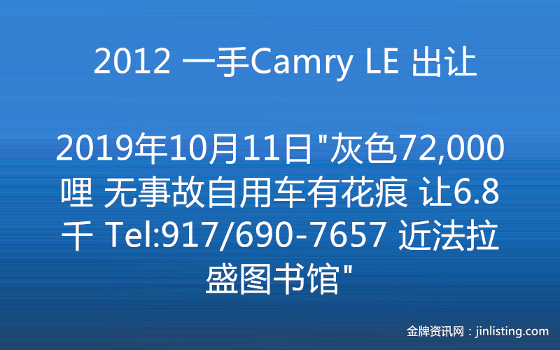 2012 一手Camry LE 出让 “灰色72,000 哩 无事故自用车有花痕 让6.8千 Tel:917/690-7657 近法拉盛图书馆”