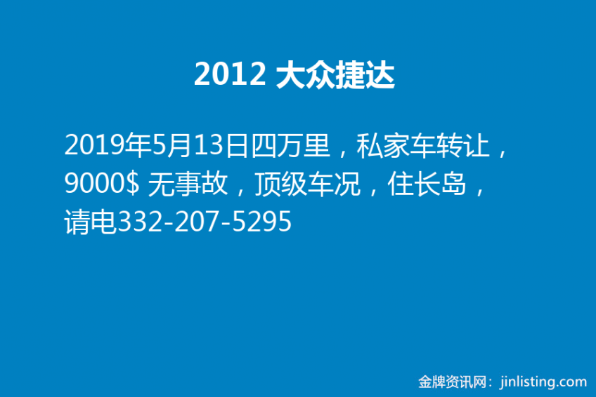 2012 大众捷达,四万里,私家车转让,9000$ 无事故,顶级车况,住长岛,请电332-207-5295