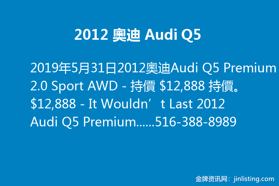 “2012 奧迪 Audi Q5 Premium 2.0 Sport AWD – 持價 $12,888 持價。$12,888 – It Wouldn’t Last 2012 Audi Q5 Premium 2.0T – AWD ( Inside Black / Outside Black ) 加热皮椅子,持大天窗、无事故、里外干净漂亮、车况好 音响好,Turbocharger , 75,000 miles Low Miles 看车电话:516-388-8989 看車 在 To See the Car – Location in ( 在 )Flushing, Queens , NY”