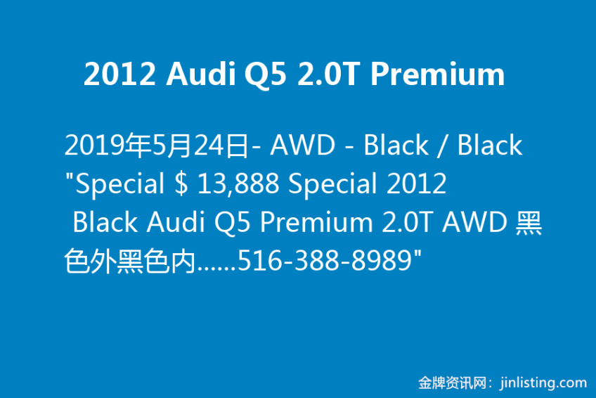 2012 Audi Q5 2.0T Premium – AWD – Black / Black “Special $ 13,888 Special 2012 Black Audi Q5 Premium 2.0T AWD 黑色外黑色内,里外都很干浄,有可加热皮椅, 持大天窗,保养佳,車况好,75,008 里 Around 10,000 per year Userage Location in Flushing 516-388-8989”