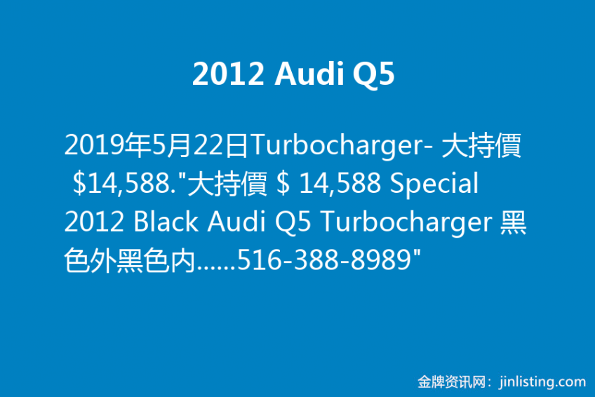 2012 Audi Q5 Turbocharger- 大持價 $ 14,588. “大持價 $ 14,588 Special 2012 Black Audi Q5 Turbocharger 黑色外黑色内,里外都很干浄,有可加热皮椅, 持大天窗,保养佳,車况好,75,008 里 Around 10,000 per year Userage Location in Flushing 516-388-8989”