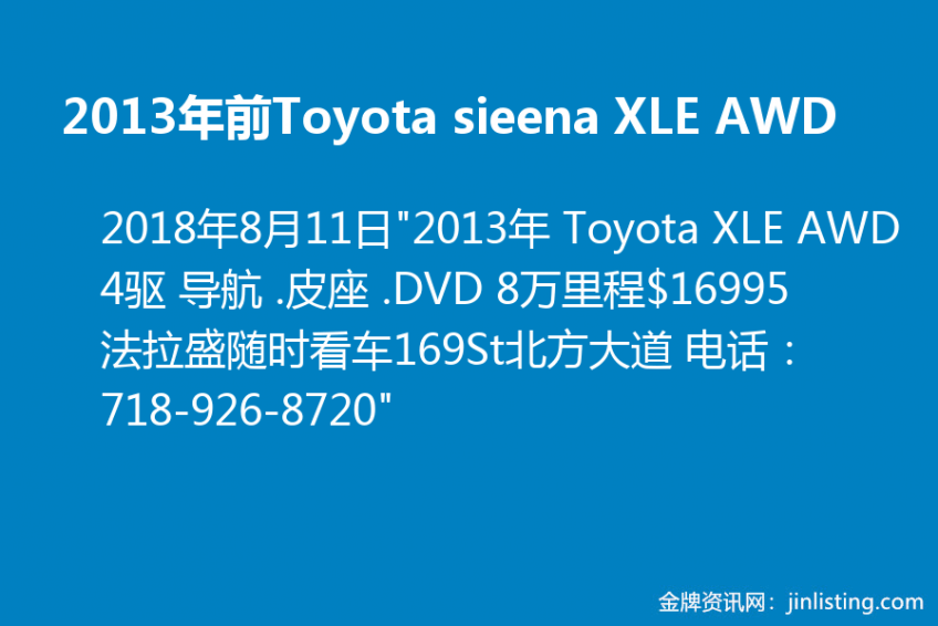 “2013年 Toyota XLE AWD 4驱 导航 .皮座 .DVD 8万里程$16995