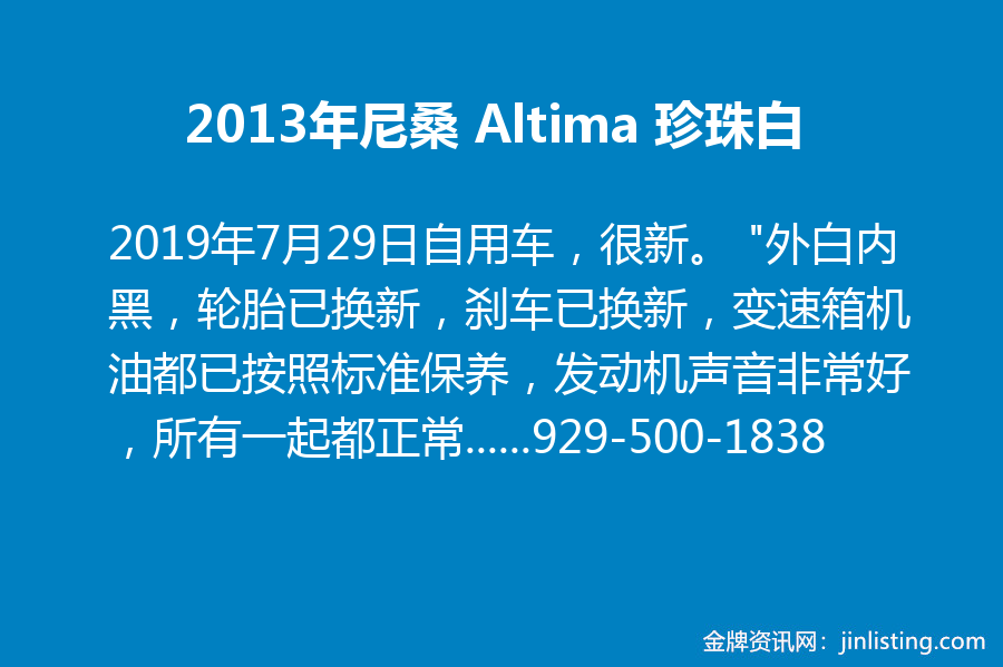 2013年尼桑 Altima 珍珠白,自用车,很新。 “外白内黑,轮胎已换新,刹车已换新,变速箱机油都已按照标准保养,发动机声音非常好,所有一起都正常。 带倒车雷达和蓝牙音乐。 无事故记录,已10万英里,主要是长途旅行驾驶. 价格$8000,可以配合做gift方式,帮你减税。 联系电话:929-500-1838(皇后区小颈或长岛大颈看车)”