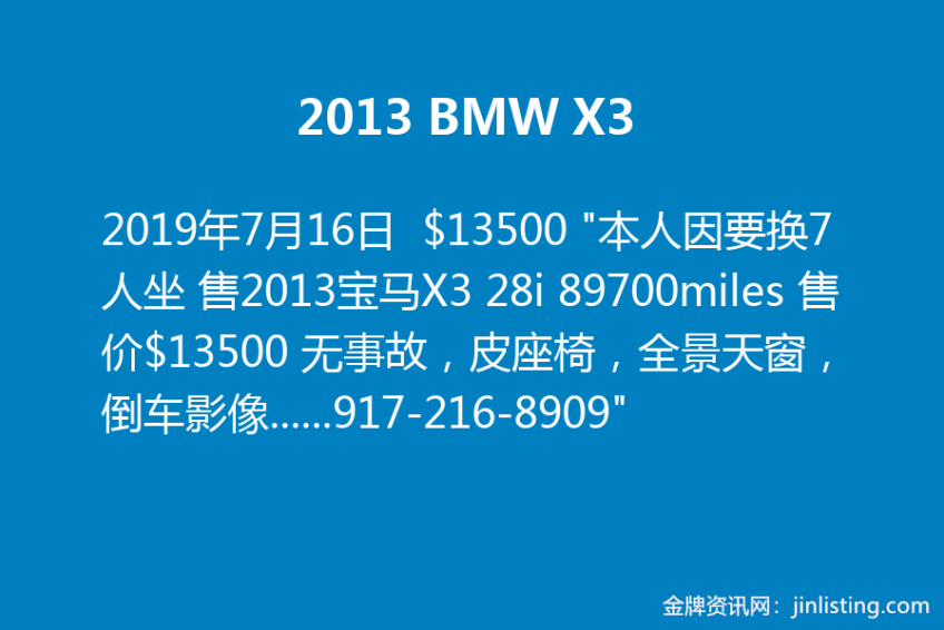 2013 BMW X3 $13500 “本人因要换7人坐 售2013宝马X3 28i 89700miles 售价$13500 无事故,皮座椅,全景天窗,倒车影像,MSport 方向盘,加装Apple Carplay, 加装LED 大灯 刚换的倍耐力轮胎,刹车片,刹车油, 去年在dealer做的valve cover 跟oil filter housing gasket 不会有漏油问题 有发票 法拉盛看车请联系电话: 917-216-8909”