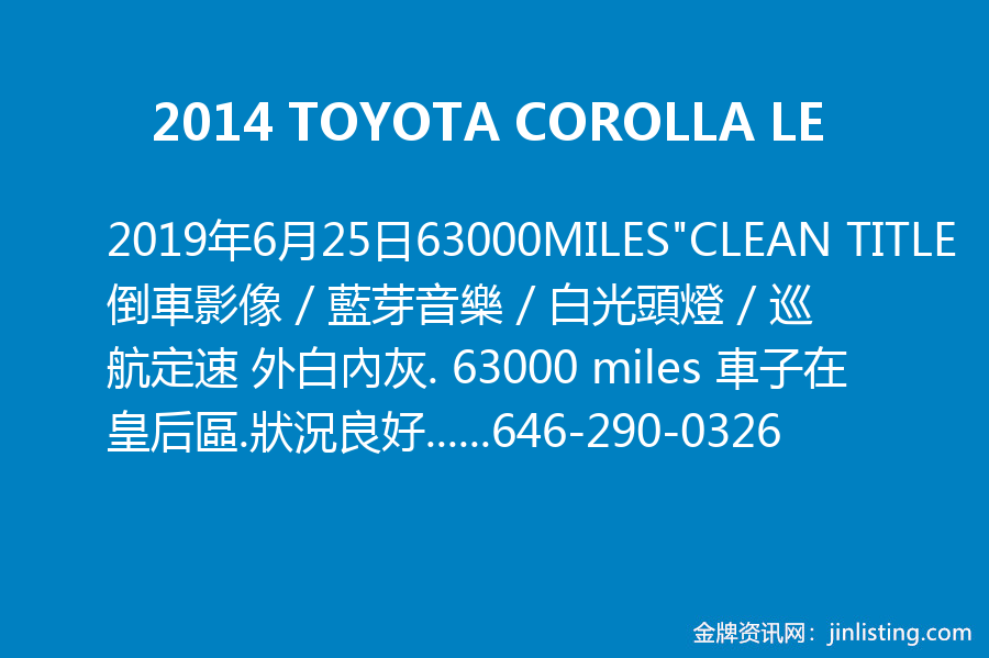 2014 TOYOTA COROLLA LE , 63000 MILES “CLEAN TITLE 倒車影像 / 藍芽音樂 / 白光頭燈 / 巡航定速 外白內灰. 63000 miles 車子在皇后區. 狀況良好 請聯繫 : wechat / weisaid0529 或是電話 : 646-290-0326 價錢$10000 可以刀. 因為回國所以賣車.”