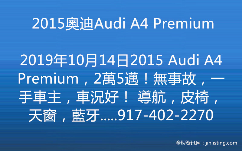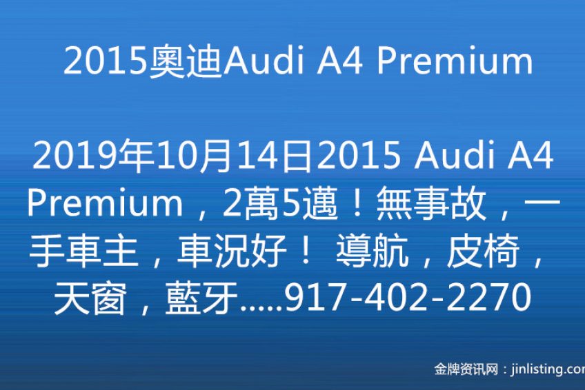 2015奧迪Audi A4 Premium,2萬5邁!導航,皮椅,天窗,四驅!$17,500, 只有一台! “2015 Audi A4 Premium,2萬5邁! 無事故,一手車主,車況好! 導航,皮椅,天窗,藍牙,加熱座椅,四輪驅動,一鍵啟動! $17,500! 原廠保修,只有一台!先到先得! 電話/短信: 917-402-2270 微信: 867252406 地址: 6124 New Utrecht Ave Brookyln NY 11219 免費提供Carfax Report 免費2個月或3000邁保修 提供貸款服務,保險咨詢,代辦過戶上牌 專業鏢車服務”