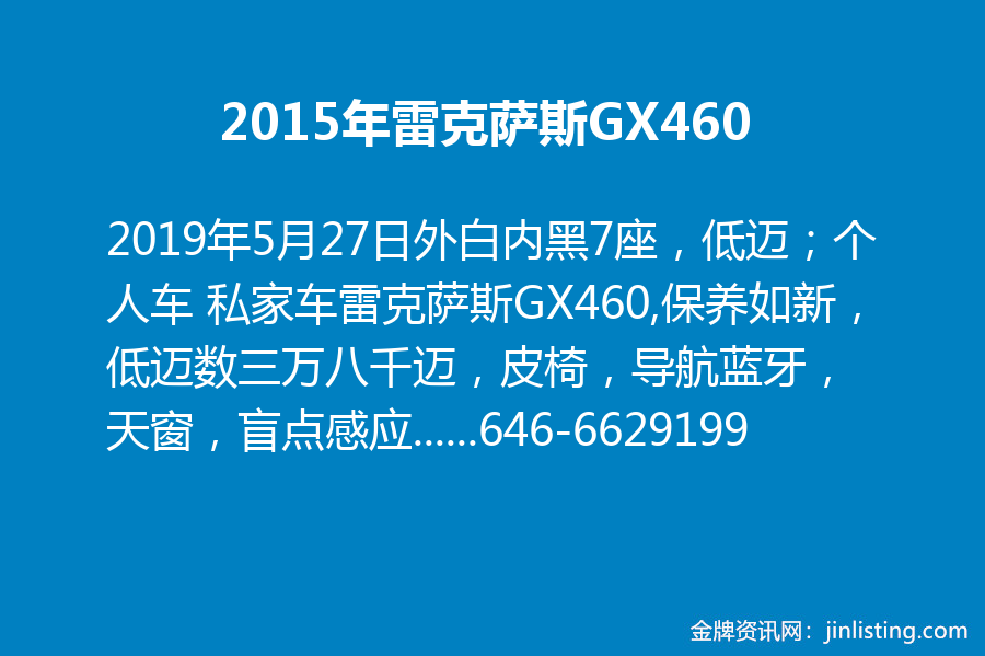 2015年雷克萨斯GX460外白内黑7座,低迈;个人车 私家车雷克萨斯GX460,保养如新,低迈数三万八千迈,皮椅,导航蓝牙,天窗,盲点感应,倒车影像,一键启动,加装前后防护杠,无任何维修事故,新换四条米其林轮胎和刹车片,意者短信联系646-6629199.法拉盛看车,实价$3.1万。