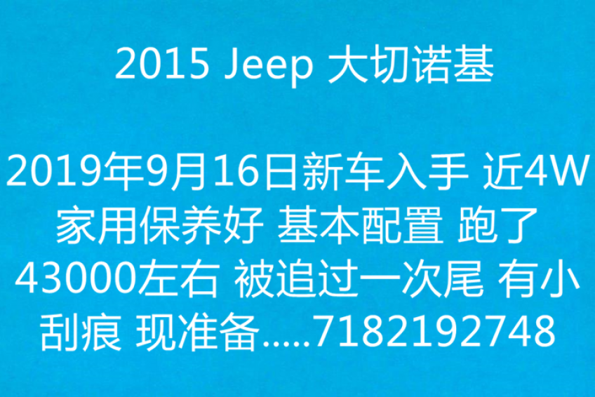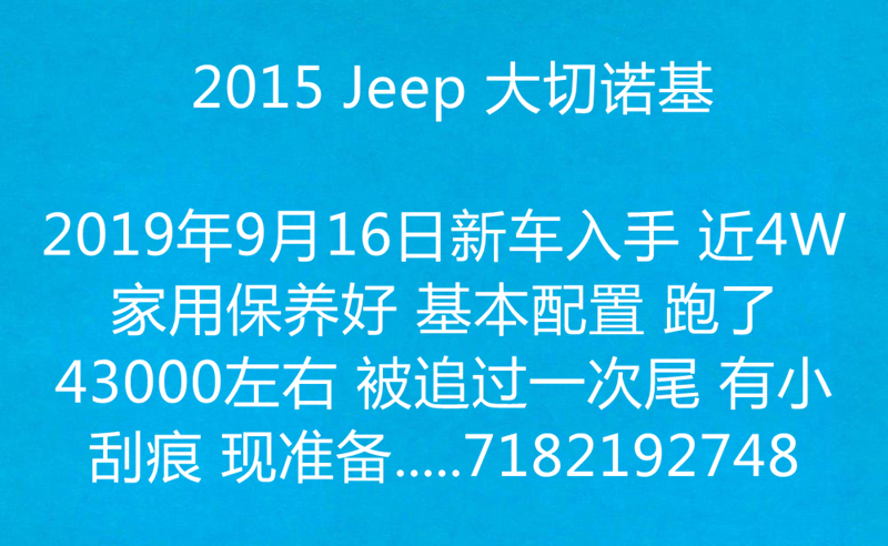 2015 Jeep 大切诺基 新车入手 近4W 家用保养好 基本配置 跑了43000左右 被追过一次尾 有小刮痕 现准备出售2W 诚心想入手的短信7182192748 车在法拉盛晚上可以开车!谢谢