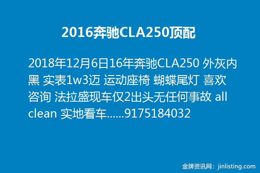 16年奔驰CLA250 外灰内黑 实表1w3迈 运动座椅 蝴蝶尾灯 喜欢咨询 法拉盛现车仅2出头无任何事故 all clean 实地看车 试驾电话9175184032微信541564928更多车型