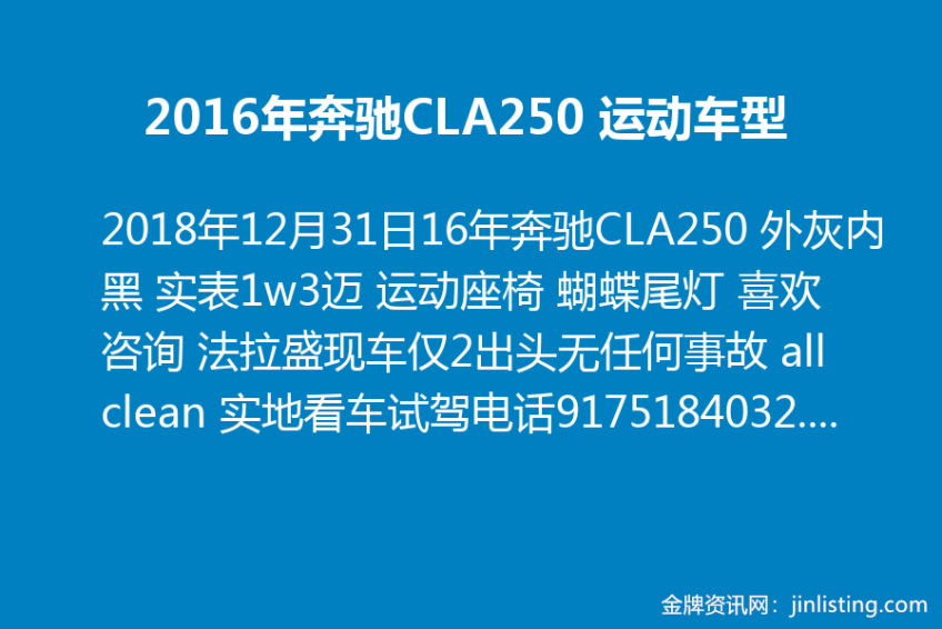 16年奔驰CLA250 外灰内黑 实表1w3迈 运动座椅 蝴蝶尾灯 喜欢咨询 法拉盛现车仅2出头无任何事故 all clean 实地看车 试驾电话9175184032微信541564928更多车型提供选车微信咨询