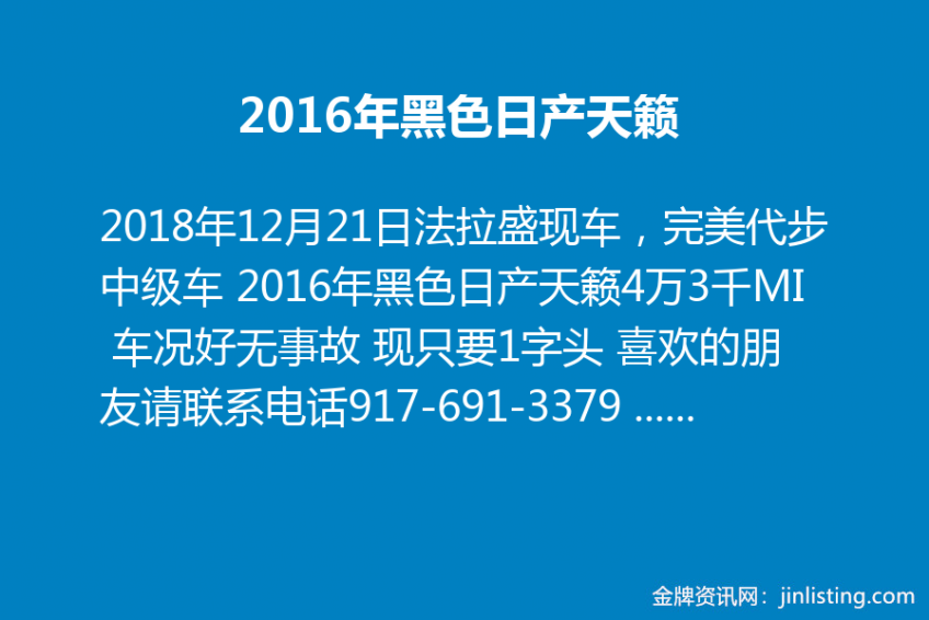 法拉盛现车,完美代步中级车 2016年黑色日产天籁4万3千MI 车况好无事故 现只要1字头 喜欢的朋友请联系电话917-691-3379 微信bin4163694