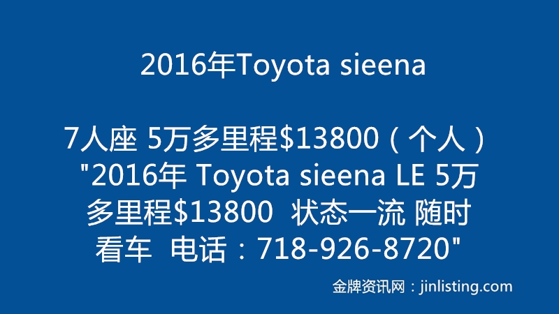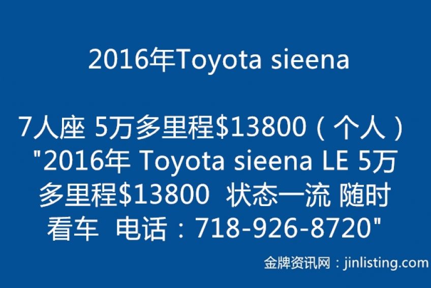 2016年Toyota sieena 7人座 5万多里程$13800(个人) “2016年 Toyota sieena LE 5万多里程$13800 状态一流 随时看车 电话:718-926-8720”