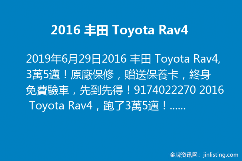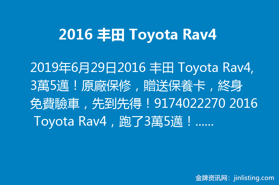 2016 丰田 Toyota Rav4,3萬5邁!原廠保修,贈送保養卡,終身免費驗車,先到先得!9174022270 2016 Toyota Rav4,跑了3萬5邁! 無事故,一手車主,車況好! 藍牙,倒車影像,四輪驅動,保值SUV! 原廠保修,贈送保養卡,終身免費驗車,洗車服務!️ 電話/短信: 917-402-2270 微信: 867252406 地址: 6124 New Utrecht Ave Brookyln NY 11219 免費提供Carfax Report 免費2個月或3000邁保修 提供貸款服務,保險咨詢,代辦過戶上牌 專業鏢車服務