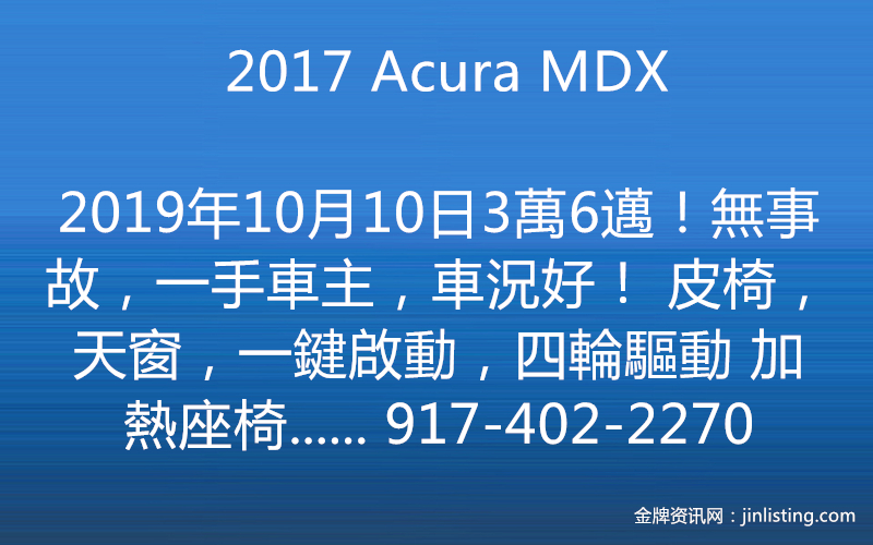 “2017 Acura MDX,3萬6邁! 無事故,一手車主,車況好! 皮椅,天窗,一鍵啟動,四輪驅動 加熱座椅,藍牙,倒車影像! 原廠保修,保值高檔日本車! 電話/短信: 917-402-2270 微信: 867252406 地址: 6124 New Utrecht Ave Brookyln NY 11219 免費提供Carfax Report 免費2個月或3000邁保修 提供貸款服務,保險咨詢,代辦過戶上牌 專業鏢車服務”