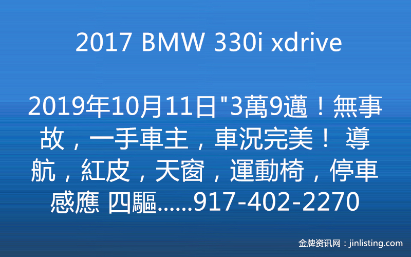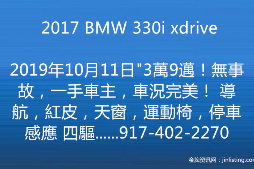 “2017 BMW 330i xdrive,3萬9邁! 無事故,一手車主,車況完美! 導航,紅皮,天窗,運動椅,停車感應 四驅,不同駕駛模式,無鑰匙啟動! 原廠保修,定期原廠保養! $22,800! 電話/短信: 917-402-2270 微信: 867252406 地址: 6124 New Utrecht Ave Brookyln NY 11219 免費提供Carfax Report 免費2個月或3000邁保修 提供貸款服務,保險咨詢,代辦過戶上牌 專業鏢車服務”