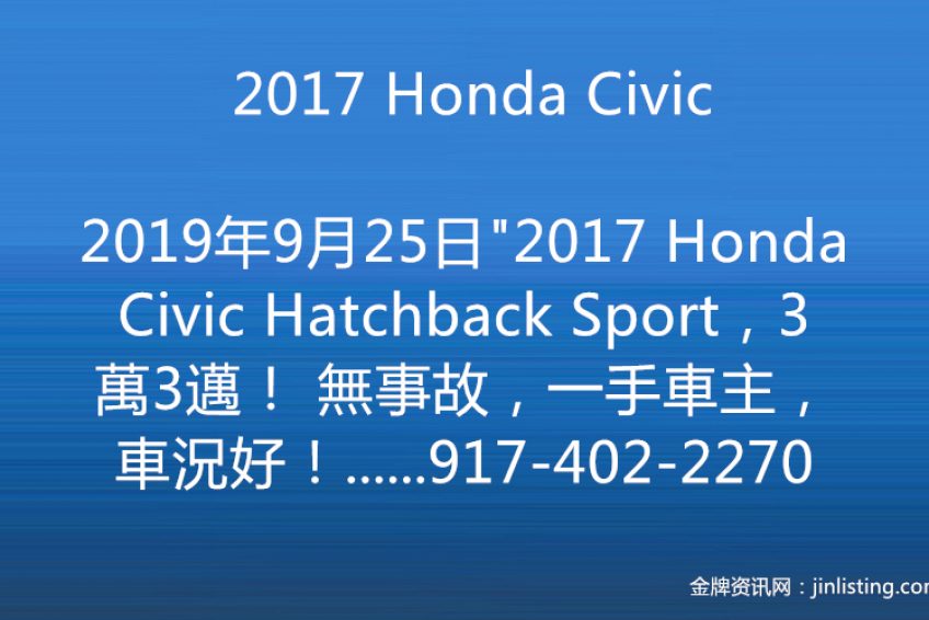 “2017 Honda Civic Hatchback Sport,3萬3邁! 無事故,一手車主,車況好! 倒車影像,藍牙,霧燈,運動版,鋁合金輪圈! 適合自用,代步,不分男女! 原廠保修,保值日本車! $17,500! 電話/短信: 917-402-2270 微信: 867252406 地址: 6124 New Utrecht Ave Brookyln NY 11219 免費提供Carfax Report 免費2個月或3000邁保修 提供貸款服務,保險咨詢,代辦過戶上牌 專業鏢車服務”
