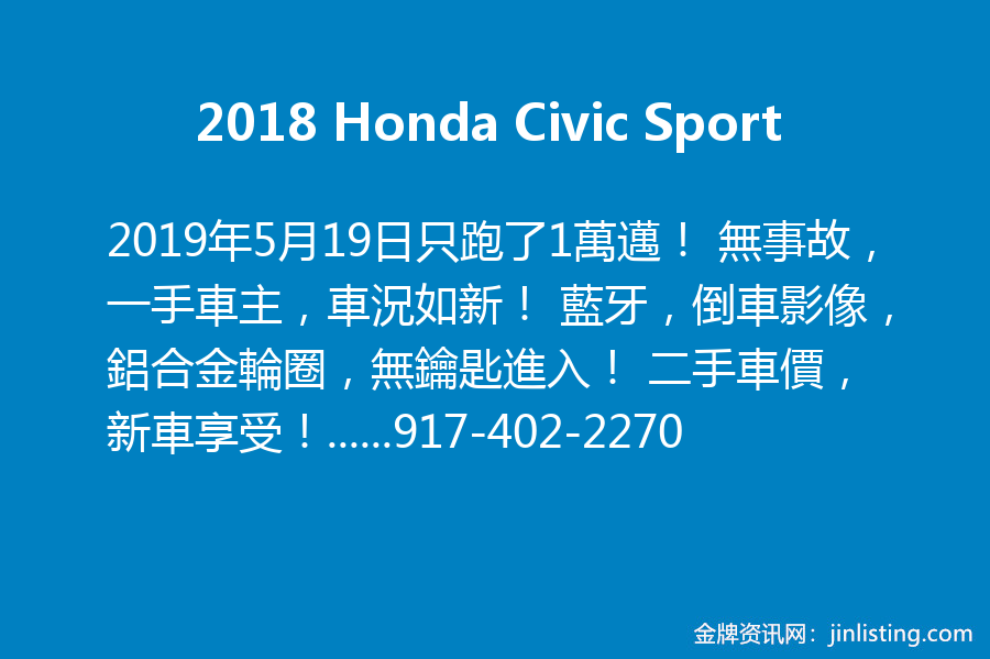 “2018 Honda Civic Sport, 只跑了1萬邁! 無事故,一手車主,車況如新! 藍牙,倒車影像,鋁合金輪圈,無鑰匙進入! 二手車價,新車享受!原廠保修,洗車服務! 電話/短信: 917-402-2270 微信: 867252406 地址: 6124 New Utrecht Ave Brookyln NY 11219 免費提供Carfax Report 免費2個月或3000邁保修 提供貸款服務,保險咨詢,代辦過戶上牌 專業鏢車服務”