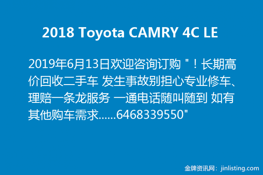 2018 Toyota CAMRY 4C LE 欢迎咨询订购 “!长期高价回收二手车 发生事故别担心专业修车、理赔一条龙服务 一通电话随叫随到 如有其他购车需求,欢迎加微信咨询6468339550或扫描下方二维码。我们将竭诚为您寻找符合您要求的好车 销售经理OWEN:6468339550 地址:210 39th Street Brooklyn NY11232 本公司在华人社区拥有多年的标车经验 良好信誉与口碑 诚信服务 让每个客人宾至如归 ! 微信号:6468339550”