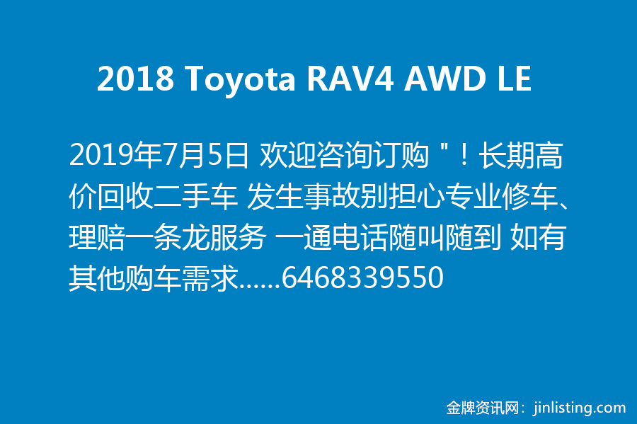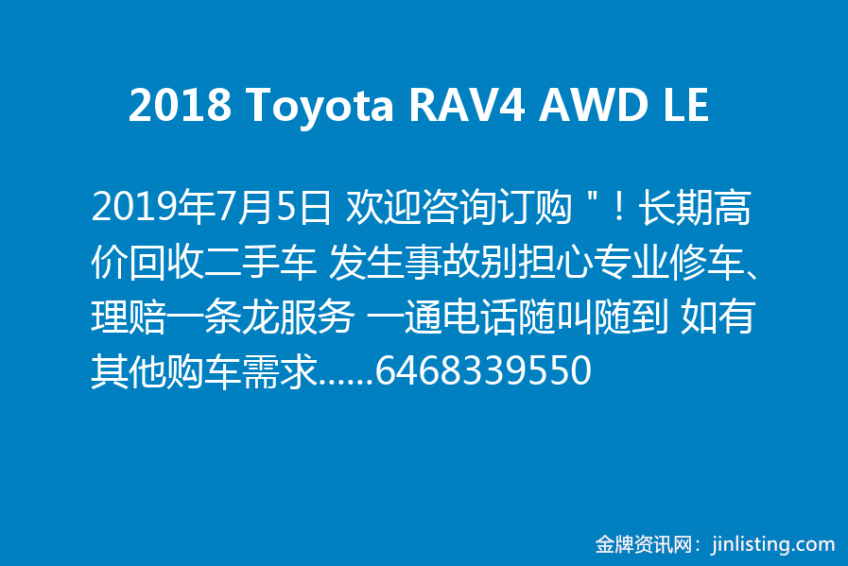 2018 Toyota RAV4 AWD LE 欢迎咨询订购 “!长期高价回收二手车 发生事故别担心专业修车、理赔一条龙服务 一通电话随叫随到 如有其他购车需求,欢迎加微信咨询6468339550或扫描下方二维码。我们将竭诚为您寻找符合您要求的好车 销售经理OWEN:6468339550 地址:210 39th Street Brooklyn NY11232 本公司在华人社区拥有多年的标车经验 良好信誉与口碑 诚信服务 让每个客人宾至如归 ! 微信号:6468339550”