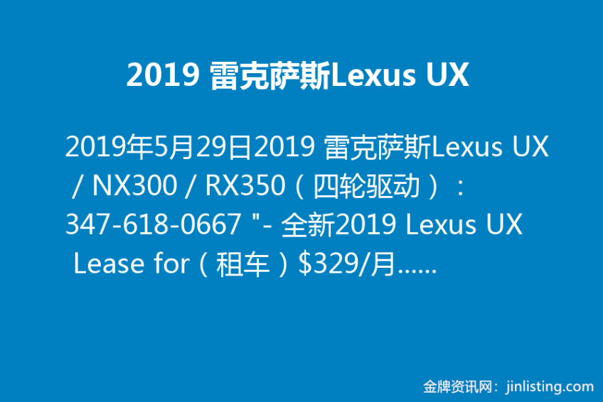 2019 雷克萨斯Lexus UX/NX300/RX350(四轮驱动):347-618-0667 “- 全新2019 Lexus UX Lease for(租车)$329/月,共36个月,仅 $2,875 Down Pay! – 全新2019 Lexus NX300 四轮驱动 Lease for(租车)$369/月,共36个月,仅 $1,835 Down Pay! – 全新2019 Lexus RX350 四轮驱动 Lease for(租车)$439/月,共36个月,仅 $2,755 Down Pay! – 全新2019 Lexus GX460 四轮驱动(三排座) Lease for(租车)$449/月,共36个月,仅 $2,755 Down Pay! 中文服务 347-618-0667 Lexus of Englewood-美东排名第一的雷克萨斯经销商4S店 地址: 53 Engle Street Englewood, NJ 07631 (离法拉盛只有十几分钟车程,离华盛顿桥G.W. Bridge只有几分钟) 网址:www.lexusofenglewood.com”