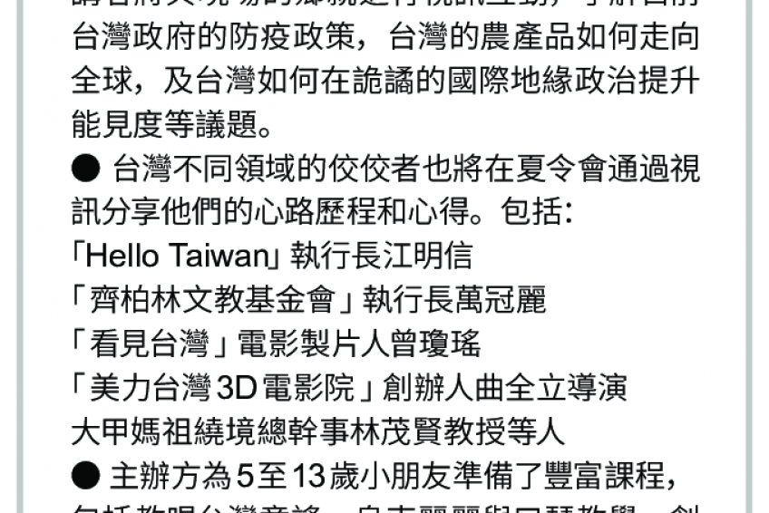 ● 主辦單位將與「Hello Taiwan」合作,提升此次夏令會在全美的知名度。