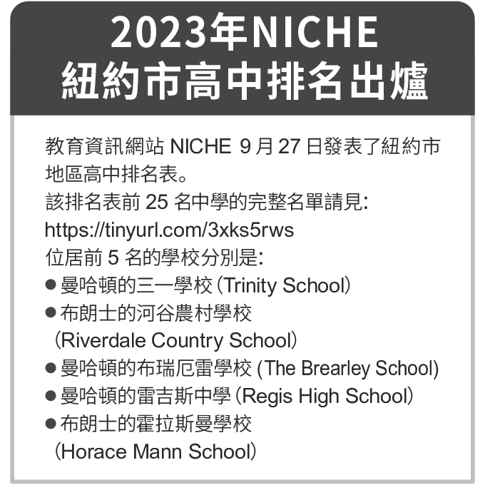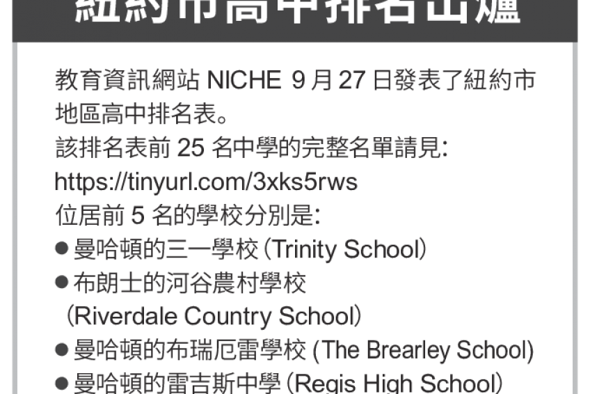 教育資訊網站NICHE 9月27日發表了紐約市地區高中排名表。