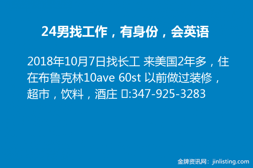 找长工 来美国2年多, 住在布鲁克林10ave 60st 以前做过装修,超市,饮料,酒庄 ☎:347-925-3283
