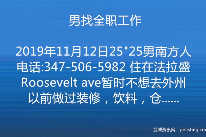 25男找全职工作 “25男南方人 电话:347-506-5982 住在法拉盛Roosevelt ave暂时不想去外州 以前做过装修,饮料,仓库,餐馆,酒庄”