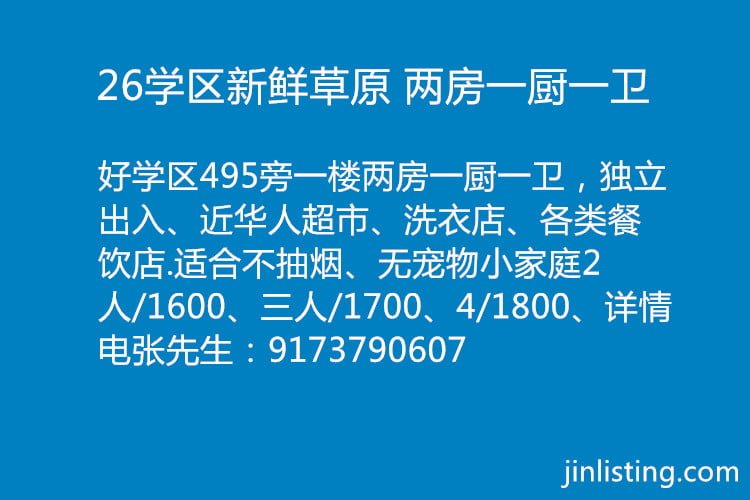 好学区495旁一楼两房一厨一卫,独立出入、近华人超市、洗衣店、各类餐饮店.适合不抽烟、无宠物小家庭2人/1600、三人/1700、4/1800、详情电张先生:9173790607