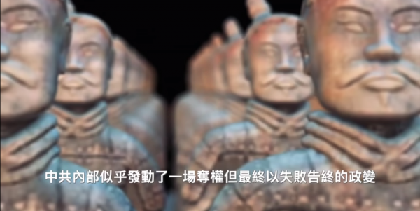 第一个事件是在中共灭亡之前后,中共内部似乎发动了一场夺权但最终以失败告终的政变。《金陵塔碑文》中的“马不点头石沉底,红花开尽白花开”,《推背图》的第四十六象“东边门里伏金剑,勇士后门入帝宫”,以及《诸葛武侯乩文》中的“宫门拔剑除奸佞,白头变作赤头人”,可能都是对这场政变的隐约描述。其中《推背图》的第四十六象似乎预示这场政变同一位姓名带“弓”或“阝”的军人相关。