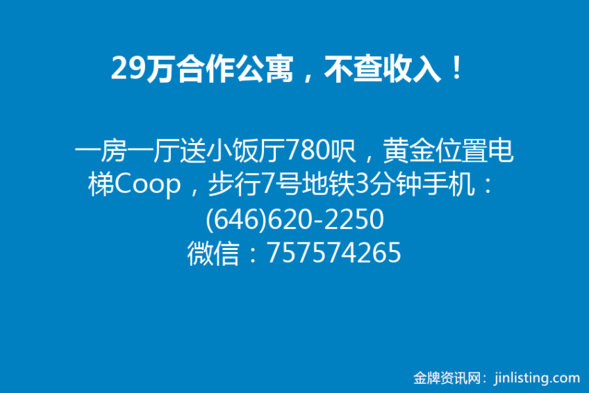 $29万全现金Jackson Heights,一房一厅送小饭厅780呎,黄金位置电梯Coop,步行7号地铁3分钟!无需装修,难得好价,机不可失!