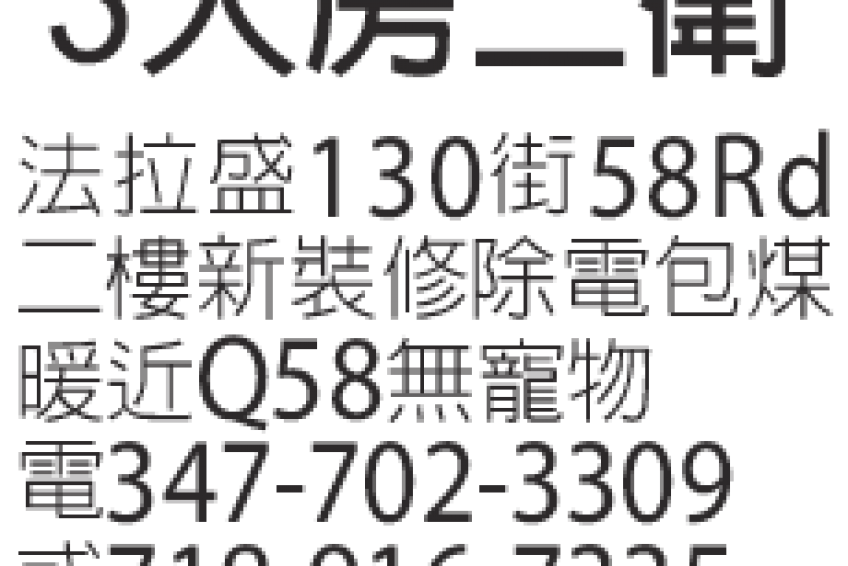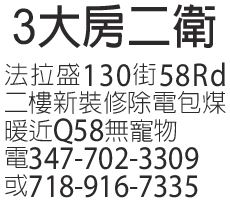 法拉盛130街58Rd 二樓新裝除電包煤暖近Q58無寵物請電3477023309或7189167335