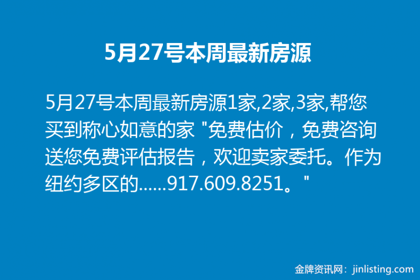 5月27号本周最新房源:1家,2家,3家,帮您买到称心如意的家 电话微信… “免费估价,免费咨询,送您免费评估报告,欢迎卖家委托。 作为纽约多区的地产协会会员,我们每周有上百套新房源供您选择,欢迎买家来电,微信或邮件告诉我们您想要的房源,其余的交给我们。 诚实专业效率,让您买的放心满意;实时更新,请常回来看看。 电话(微信):917.609.8251。”