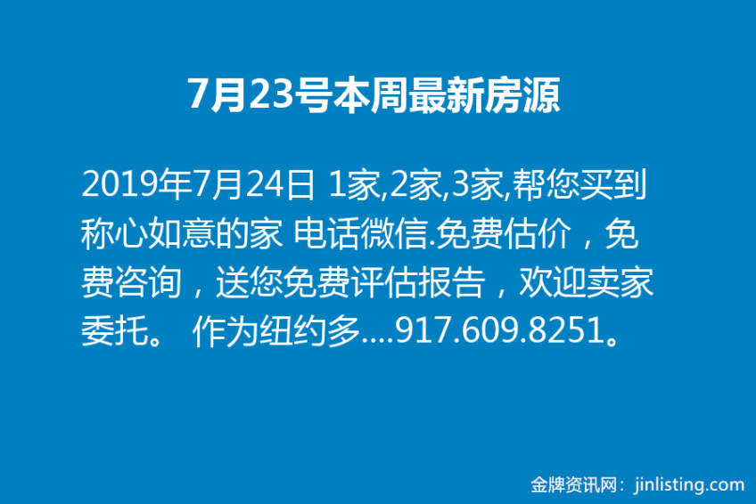 7月23号本周最新房源:1家,2家,3家,帮您买到称心如意的家 电话微信… 免费估价,免费咨询,送您免费评估报告,欢迎卖家委托。 作为纽约多区的地产协会会员,我们每周有上百套新房源供您选择,欢迎买家来电,微信或邮件告诉我们您想要的房源,其余的交给我们。 诚实专业效率,让您买的放心满意;实时更新,请常回来看看。 电话(微信):917.609.8251。