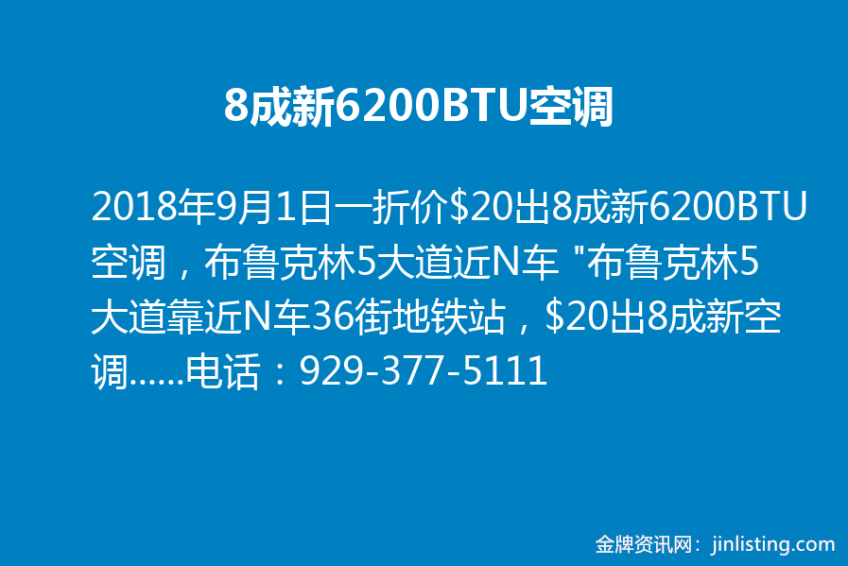 一折价$20出8成新6200BTU空调,布鲁克林5大道近N车 “布鲁克林5大道靠近N车36街地铁站,$20出8成新空调,freidrich品牌,6200BTU,完全正常运行,但是不带遥控器,最低可制冷到60华氏度,可以立即和我联系,只能在8月31号上午上门取货,不负责运送,所以是超低价。 微信:chesterqing2017 电话:929-377-5111(请发短信)”