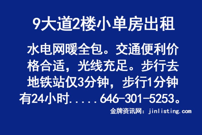 9大道2楼小单房出租。水电网暖全包。交通便利价格合适,光线充足。步行去地铁站仅3分钟,步行1分钟有24小时洗衣房。适合上班族少炊人士。有意看房者请致电646-301-5253.如若漏接电话可发短信。