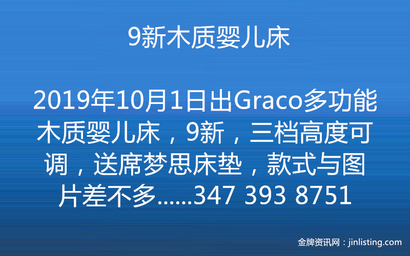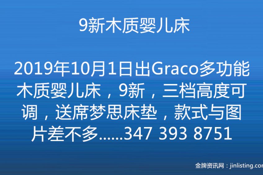 9新木质婴儿床 出Graco多功能木质婴儿床,9新,三档高度可调,送席梦思床垫,款式与图片差不多,只有一张实图,抱歉由于其他床板与床垫都用胶袋包住防尘所以无实图,用了大半年,现在孩子带回国内所以闲置了,售$80刀,Elmhurst自提,可短信至347 393 8751